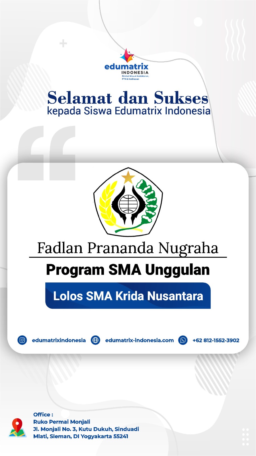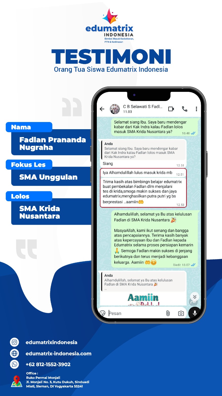 Dengan bimbingan dari Edumatrix Indonesia, maka kamu bisa mendapatkan edukasi materi, tips & trik menjawab tes hingga menempa mental sebaik mungkin. Semua adalah modal yang dibutuhkan untuk bisa meningkatkan kesempatan terbaikmu untuk bisa sukses di sekolah. Ditambah dengan dukungan tenaga pengajar profesional yang siap membantu untuk mewujudkannya.